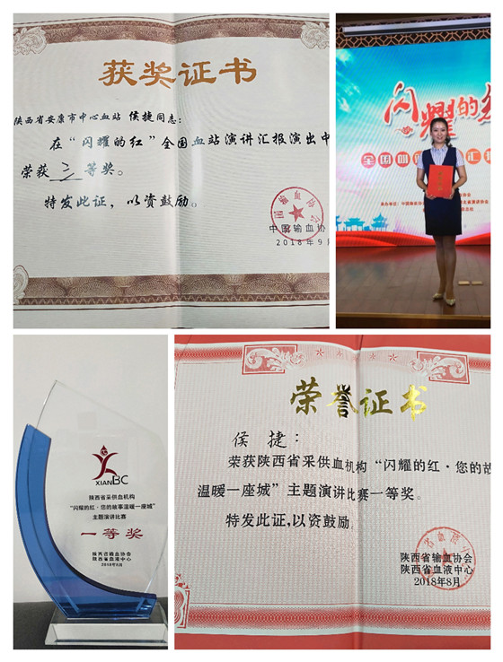 我站血源管理科侯捷同志,根據(jù)自己血站崗位工作成長(zhǎng)經(jīng)歷,結(jié)合血源一線(xiàn)招募典型事例,充分展示安康無(wú)償獻(xiàn)血招募宣傳模式,以“成長(zhǎng)在生命年輪中的信仰”為題,代表安康市中心血站參加陜西省“閃耀的紅--您的故事溫暖一座城”血站系統(tǒng)演講比賽,以獨(dú)特的視角和演講效果奪得冠軍,并選派于9月21日代表陜西省采供血行業(yè)參加“閃耀的紅”全國(guó)血站演講比賽榮獲三等獎(jiǎng),是我站首次在全省、全國(guó)演講比賽中取得的最佳成績(jī),為我站在全國(guó)范圍內(nèi)贏(yíng)得了榮譽(yù),為安康、陜西血站行業(yè)系統(tǒng)爭(zhēng)了光,在全國(guó)血液行業(yè)內(nèi)展示了我站職工昂揚(yáng)向上的精神風(fēng)貌。