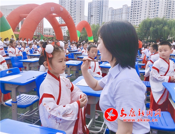 開筆禮儀式在博物館司儀老師的主持下,14名班主任教師、732名新生,身著漢服精神抖擻地進入“啟蒙門”,有序進行正衣冠、拜孔子、朱砂啟智、擊鼓明智、啟蒙描紅等體驗活動,領(lǐng)導(dǎo)嘉賓和老師們俯身參與其中,和孩子們同心同樂,共同見證開筆禮的神圣時刻。在“時光信箱”環(huán)節(jié),家長代表們身著卡通道具服,手持“時光信箱”環(huán)游操場一周,收集所有爸爸媽媽對孩子的期盼和祝福,此時孩子們歡呼雀躍,好不熱鬧,操場頓時變成了歡樂的海洋。