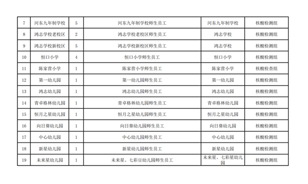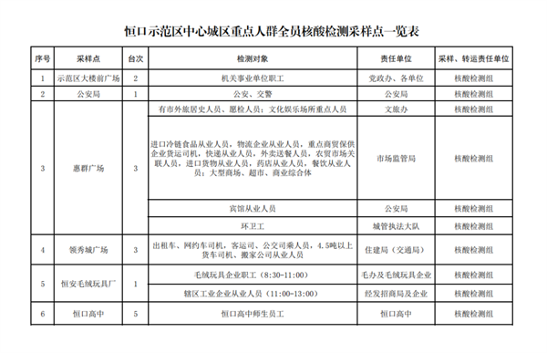 按行業(yè)、類別、區(qū)域,共設(shè)置19個采樣點、40個采樣臺(見附件),具體由各行業(yè)牽頭部門、責(zé)任單位統(tǒng)一安排采樣點設(shè)置、人員組織、秩序維護(hù),檢測對象按照牽頭部門、責(zé)任單位的具體要求,分時段有序到指定地點進(jìn)行采樣,避免人群聚集。
