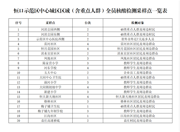 共設(shè)置20個(gè)采樣點(diǎn)、53個(gè)采樣臺(見附件),由相關(guān)責(zé)任單位統(tǒng)一負(fù)責(zé)采樣點(diǎn)設(shè)置、人員組織、秩序維護(hù),檢測對象按現(xiàn)場工作人員要求,有序到指定地點(diǎn)進(jìn)行采樣,避免人員聚集。