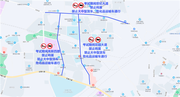1、花園大道(安康大道至世紀(jì)大道)、世紀(jì)大道(新路口環(huán)島至五路口環(huán)島)、高新四路,所有通行車輛于6月6日21時至6月8日21時,無論遇到何種情況,一律禁止鳴笛,禁止大中型貨車、?;愤\輸車通行。