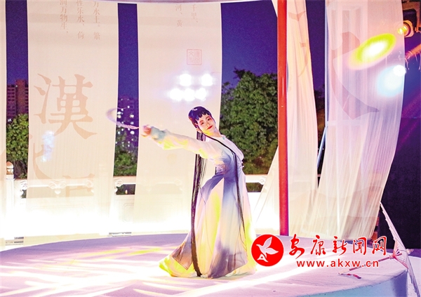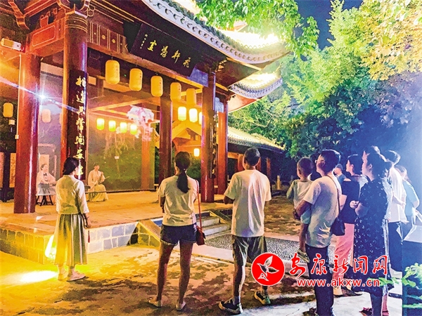 還未走近安瀾樓,就被一首琵琶曲改編的絲竹樂曲《春江花月夜》吸引,流暢多變的節(jié)奏,巧妙細膩的配器,絲絲入扣的演奏,仿佛將觀眾帶入那個月夜春江的迷人景色。環(huán)繞安瀾樓四周,畫家楊炳昌筆下的金州八景,仿佛一秒穿越古今,勝景徐徐、浮現腦際。