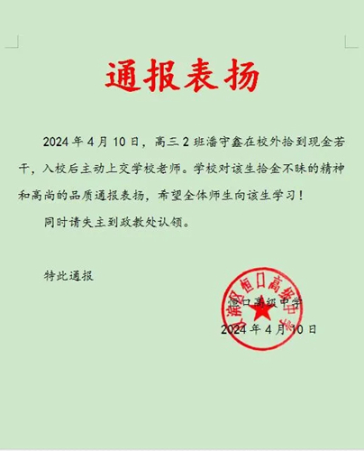 該校對(duì)潘守鑫同學(xué)拾金不昧的善舉進(jìn)行了表?yè)P(yáng),并號(hào)召全校師生學(xué)習(xí)這種拾金不昧的精神,充分發(fā)揚(yáng)中華民族的傳統(tǒng)美德。