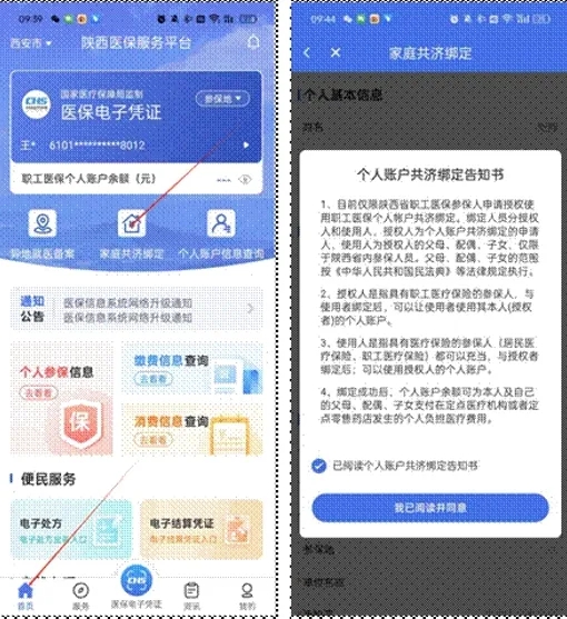 進(jìn)入陜西醫(yī)保APP后,在首頁(yè)菜單中,選擇“家庭共濟(jì)綁定”,進(jìn)入頁(yè)面后仔細(xì)閱讀告知書內(nèi)容,閱讀完成后勾選“已閱讀個(gè)人賬戶共濟(jì)綁定告知書”,點(diǎn)擊“我已閱讀并同意”按鈕,進(jìn)入家庭共濟(jì)信息填寫頁(yè)面。