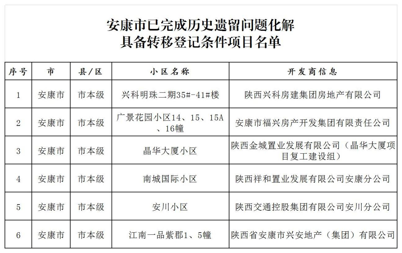 安康市市本級已完成住房領域不動產“辦證難”問題化解具備轉移登記條件項目名單的公告