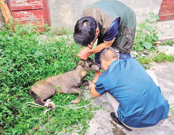 有著多次救助野生動(dòng)物經(jīng)驗(yàn)的八仙保護(hù)站站長鄒奎兵,一邊安撫驚恐不安的野羊,一邊聯(lián)系當(dāng)?shù)孬F醫(yī)準(zhǔn)備救治。針劑急救,傷口處理,很快就緒,并臨時(shí)安置在千家坪林場廢棄的場院中。