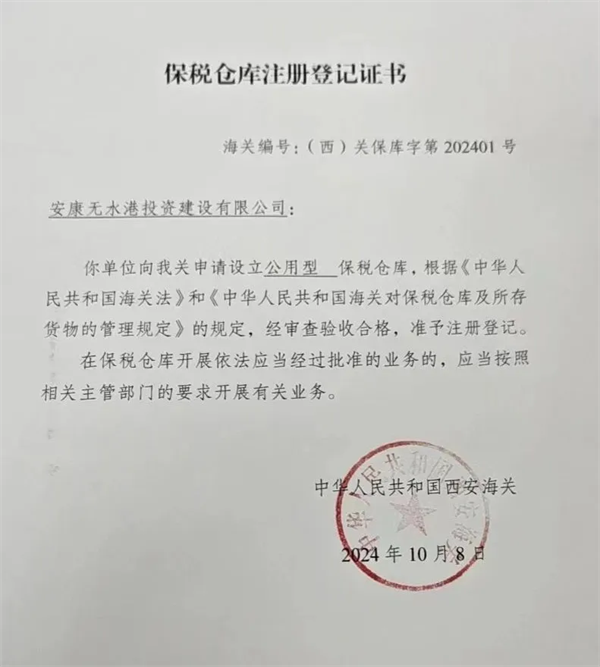 10月8日,由恒口示范區(qū)申請設(shè)立的“公用型保稅倉庫”正式通過海關(guān)審查驗收,成功獲得由西安海關(guān)頒發(fā)的《保稅倉庫注冊登記證書》,標(biāo)志著該保稅倉已具備正式運營資質(zhì)和能力,可正式對外開展實際業(yè)務(wù)。