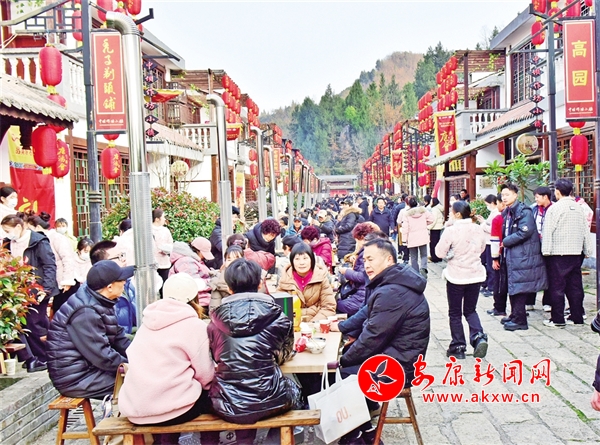 “開席啰……”隨著一聲鑼響,充滿儀式感的省級(jí)非遺庖湯盛宴正式開始。古色古香的店鋪門頭掛滿紅燈籠,石板鋪成的長街上,賓客8人一桌圍爐而坐,道道美食依次上席,說菜人“口吐蓮花”,菜越說越香;酒歌高亢,越喝越暖;猜拳行令,秦巴漢子盡顯豪邁風(fēng)采;作坊小鎮(zhèn)高朋滿座,滿滿年味十里香飄。