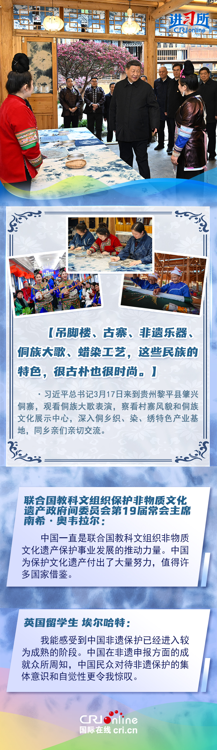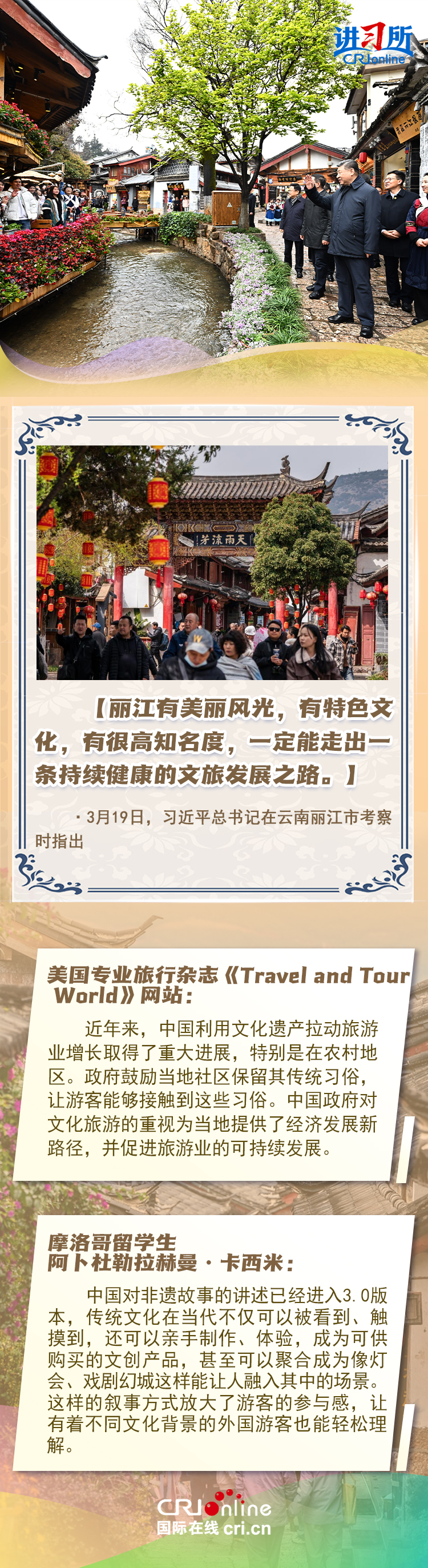習(xí)近平總書記近日赴貴州、云南考察。他走進民族特色村寨、歷史文化古城,心系歷史文化遺產(chǎn)保護和文旅融合發(fā)展。習(xí)近平特別叮囑當?shù)毓賳T和群眾,既要保護有形的村落、民居、特色建筑風(fēng)貌,傳承無形的非物質(zhì)文化遺產(chǎn),又要推動其創(chuàng)造性轉(zhuǎn)化、創(chuàng)新性發(fā)展。