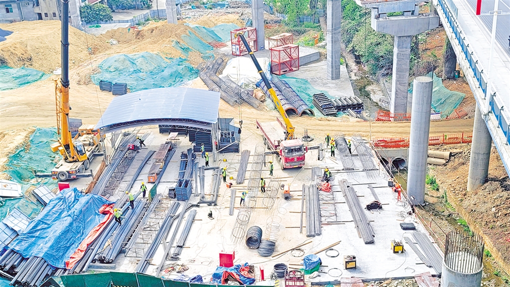 4月9日,七里溝立交橋項目建設(shè)現(xiàn)場一角,施工者正在綁扎鋼筋。 周亭松 攝