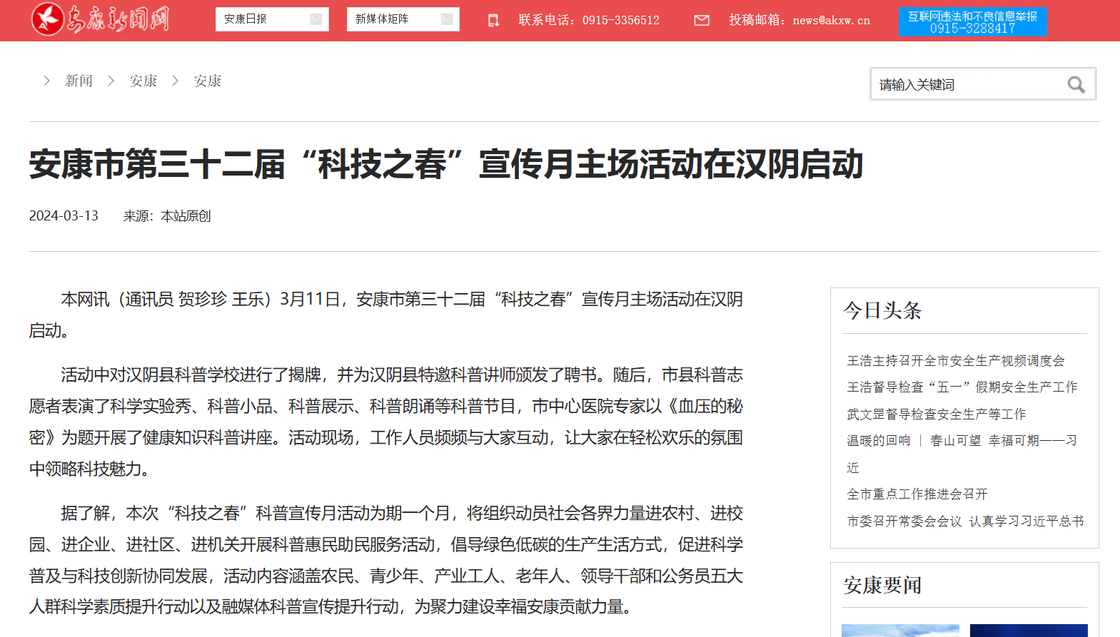 《安康市第三十二屆“科技之春”宣傳月主場(chǎng)活動(dòng)在漢陰啟動(dòng)》(2024-03-13發(fā)布)
