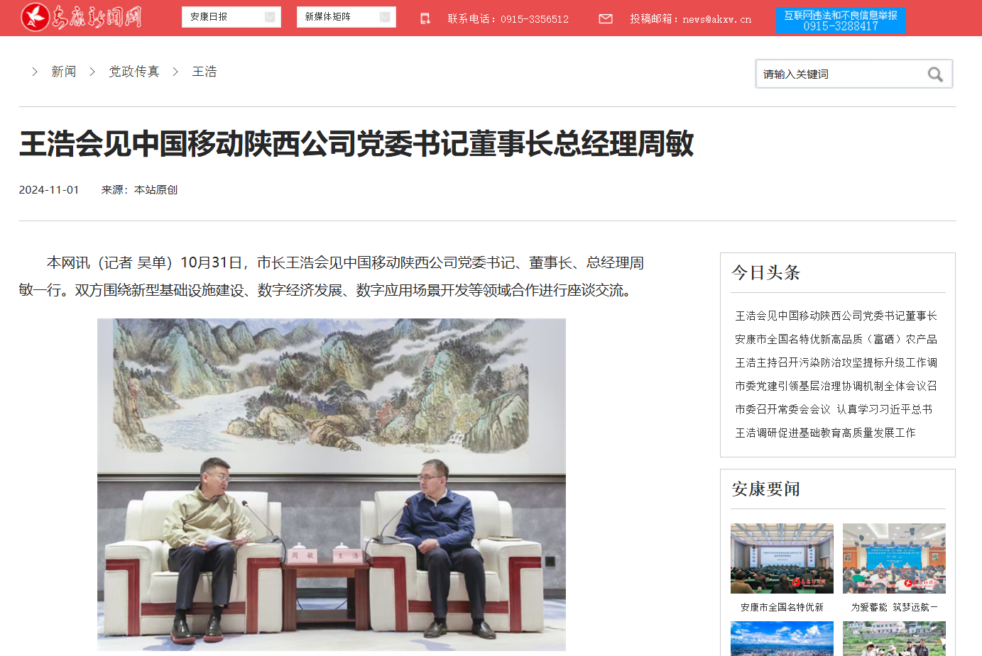 《王浩會(huì)見(jiàn)中國(guó)移動(dòng)陜西公司黨委書(shū)記董事長(zhǎng)總經(jīng)理周敏》(2024-11-01發(fā)布)