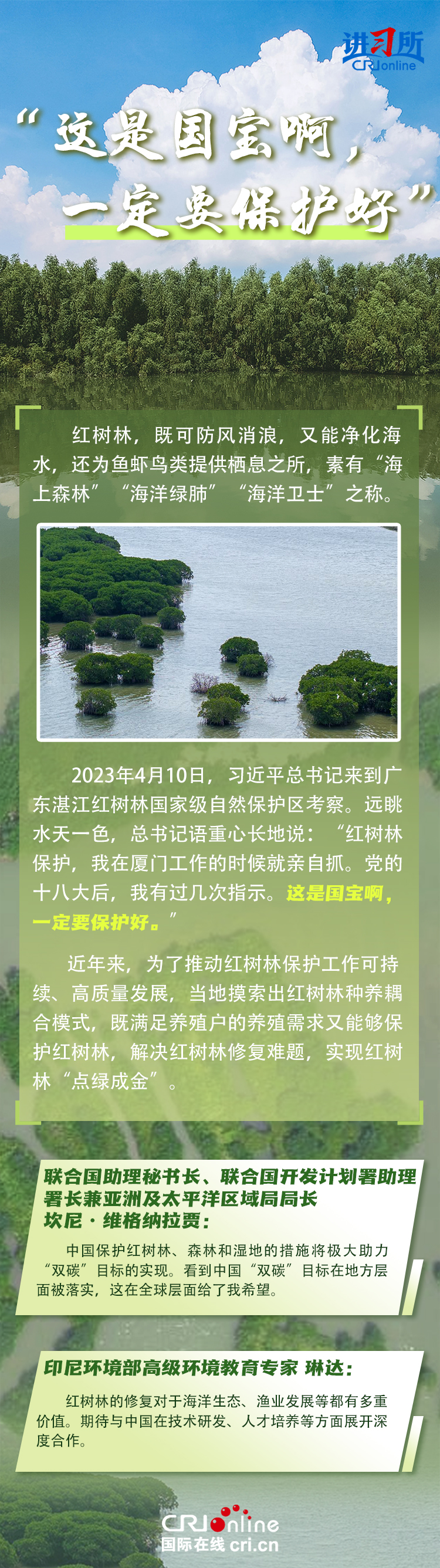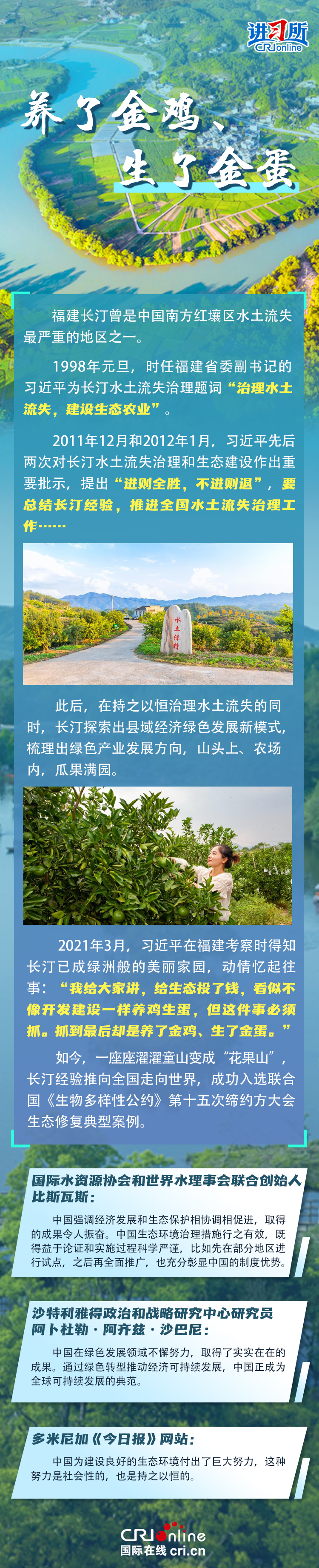 新時代以來,在習近平生態(tài)文明思想的科學指引下,“兩山”理念已深入人心,從“點綠成金”的紅樹林到一座座“花果山”,再到走向世界的長汀經(jīng)驗……美麗中國建設(shè)邁出重大步伐,生態(tài)環(huán)境保護發(fā)生歷史性變化。國際社會認為,中國取得廣泛的綠色發(fā)展成就,從根本上源于習近平生態(tài)文明思想,特別是“兩山”理念的指引。在通過綠色轉(zhuǎn)型推動經(jīng)濟可持續(xù)發(fā)展方面,中國正成為全球可持續(xù)發(fā)展的典范。