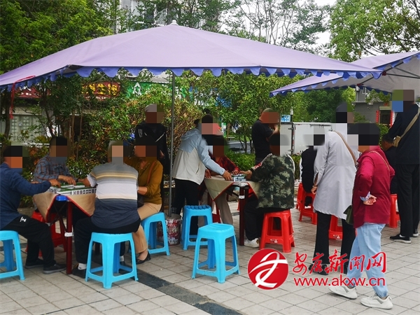 5月14日,記者實地走訪發(fā)現(xiàn),廣場上的確有人撐著遮陽傘,擺放3桌手碼麻將供人打。廣場中心的花壇里,也同樣撐著遮陽傘,擺了2桌麻將。而公廁后面的涼亭里、供水房前面及金堂寺方向的人行道上則成了撲克牌區(qū),分散的三個地方總計有20桌以上,每張桌上都有4人在“挖坑”。
