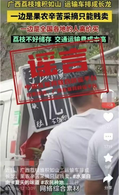 真相:6月12日,網(wǎng)傳“近日廣西荔枝堆積如山,運輸車排成長龍。果農(nóng)辛苦采摘只能賤賣”的視頻,畫面顯示荔枝堆積和“靈山荔枝1元”字樣。經(jīng)核查,視頻內(nèi)容并非發(fā)生在靈山縣。目前,靈山荔枝“妃子笑”等中熟品種逐漸批量上市,大規(guī)模上市時間為6月20日左右,當前荔枝產(chǎn)銷有序開展,并未發(fā)現(xiàn)個別媒體報道的“荔枝滯銷賤賣”“采摘堆積成山”“運輸車排成長龍”的情況,也沒有發(fā)現(xiàn)價格低到1元的荔枝出售。(來源:“廣西互聯(lián)網(wǎng)違法和不良信息舉報”微信公眾號)