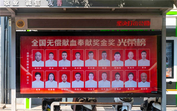 在第22個世界獻(xiàn)血者日到來之際,安康市中心血站精心策劃,自6月中旬起,在位于市政務(wù)大廳、市中心醫(yī)院、市中心醫(yī)院北院區(qū)門前的三處公交候車亭,以及中心城區(qū)兩處LED大屏上,全天循環(huán)展播著安康市榮獲“全國無償獻(xiàn)血奉獻(xiàn)獎”終身榮譽(yù)獎、金獎、銀獎、銅獎的獲獎?wù)叽盹L(fēng)采照片。