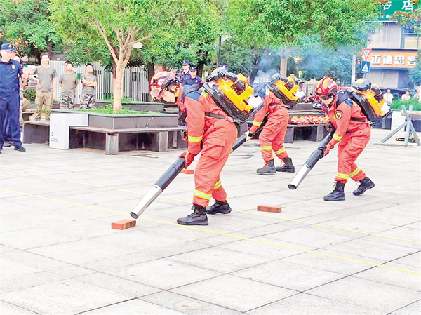 完成后,隊(duì)員迅速背負(fù)風(fēng)力滅火機(jī),將起點(diǎn)處的紅磚吹過(guò)10米終點(diǎn)處。風(fēng)力滅火機(jī)呼嘯作響,隊(duì)員們需精準(zhǔn)控制風(fēng)力方向和強(qiáng)度,這模擬的是實(shí)戰(zhàn)中清理障礙物、開(kāi)辟隔離帶的場(chǎng)景。