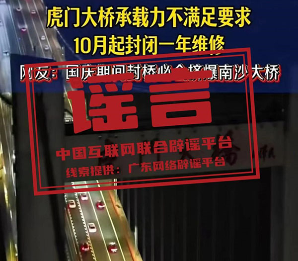 真相:近日,網(wǎng)絡(luò)上流傳“虎門大橋10月起封閉維修”的消息。經(jīng)東莞日報記者核實,該信息不準(zhǔn)確?;㈤T大橋在國慶假期期間將正常通行且繼續(xù)實行免費政策。9月29日,廣東虎門大橋有限公司明確表示:虎門大橋在2026年春節(jié)前不會采取全封或半封措施,具體封閉時間及方案,目前均未確定。據(jù)悉,此前東莞市發(fā)展和改革局曾發(fā)布過相關(guān)評估前的公示,其中提到預(yù)計開工時間,但并非實際施工時間。(來源:“廣東省互聯(lián)網(wǎng)舉報中心”微信公眾號、東莞日報)