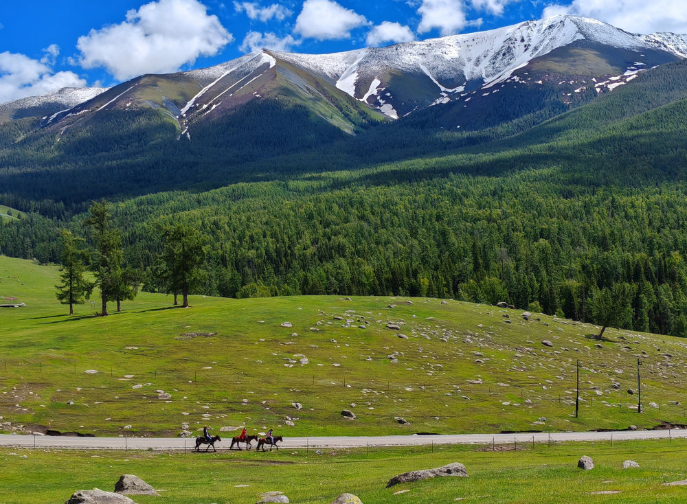 2024年6月4日,游客在新疆阿勒泰地區(qū)哈巴河縣騎馬游玩。電視劇《我的阿勒泰》播出后,新疆阿勒泰地區(qū)迎來客流高峰,“張鳳俠的小賣部”“巴太樹”“彩虹布拉克”等劇中地點成為熱門旅游打卡地。這場“邊城”與“熱劇”雙向奔赴的文旅盛宴,為當(dāng)?shù)亟?jīng)濟發(fā)展帶來新的增長點。2024年5月,當(dāng)?shù)亟哟慰?15.03萬人次,同比增長60.81%;實現(xiàn)旅游收入36.53億元,同比增長88.25%。