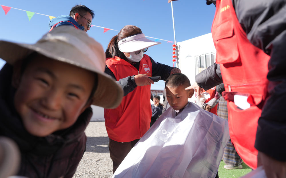 ??2025年1月26日,志愿者在西藏拉孜縣吉如村安置點為孩子們理發(fā)。西藏定日縣6.8級地震發(fā)生后,志愿者們迅速參與救援搜救、協(xié)助搭建帳篷、搬運賑濟物資、協(xié)調(diào)村民所需。數(shù)百名大學生組成志愿者服務隊,白天為安置點的孩子們輔導作業(yè)、陪孩子們運動;晚上組成巡邏隊,守護安置點的安寧。