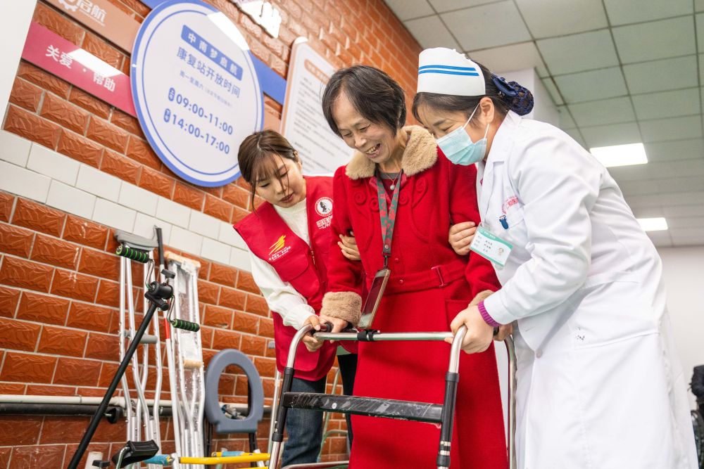 ??2025年11月6日,志愿者及醫(yī)務人員在湖南長沙望城區(qū)高塘嶺街道中南社區(qū)幫助行動不便的居民使用康復器具。