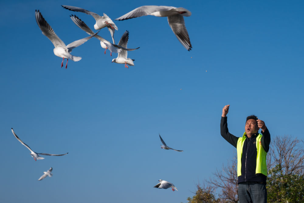 ??2024年12月11日,志愿者張利云在云南昆明王官濕地公園投喂紅嘴鷗。志愿者張利云堅持投喂紅嘴鷗長達十余年,為生態(tài)環(huán)境保護貢獻個人力量。