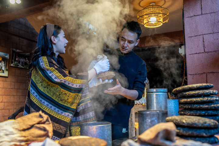 2024年4月13日,一名俄羅斯塔斯社記者(右)在大理市體驗包裝下關沱茶。據統(tǒng)計,2025年1月至6月,云南省接待入境過夜游客251.03萬人次,同比增長86%。