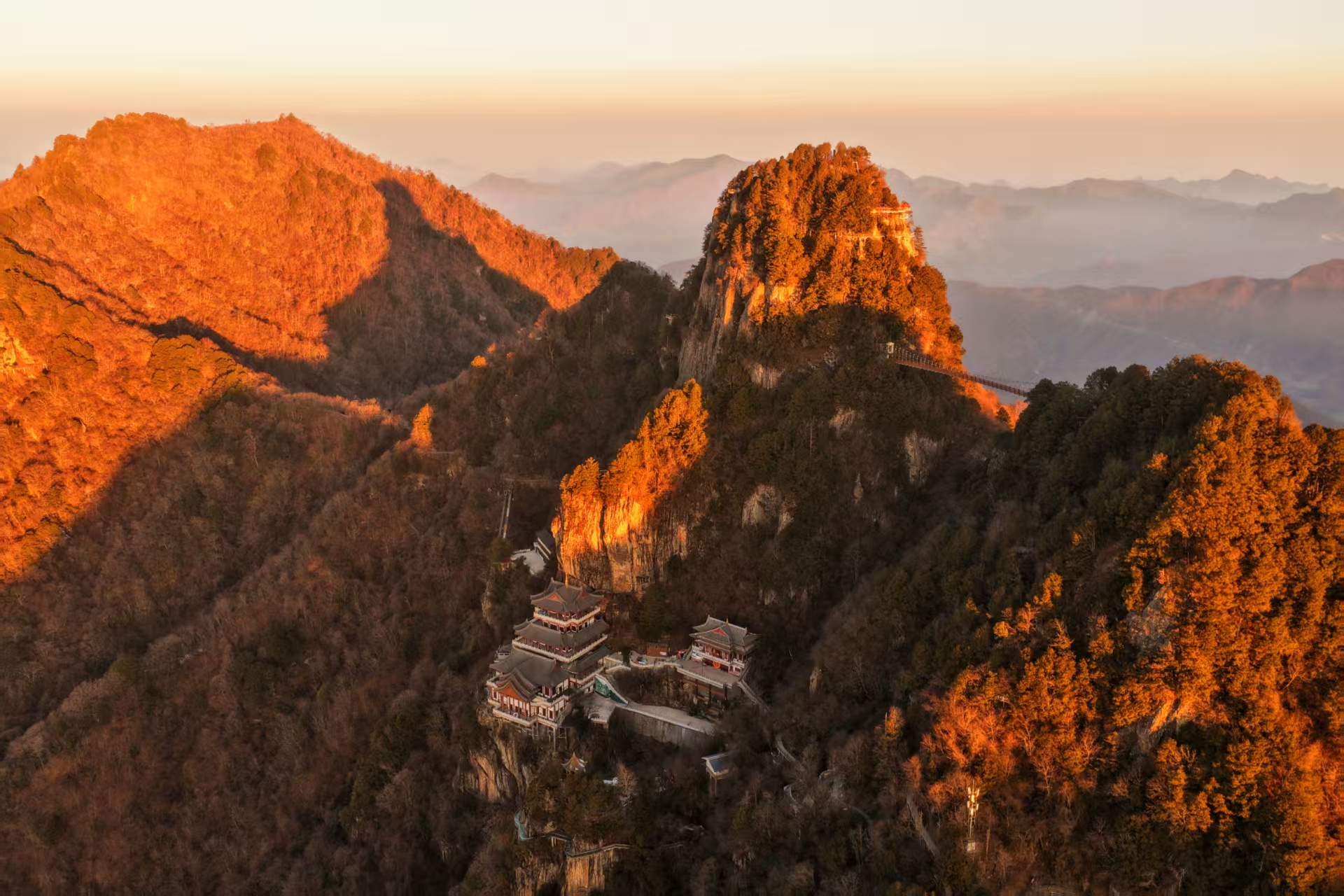 冬日清晨,登高俯瞰嵐皋縣南宮山景區(qū),群峰籠罩于晨霧之中。朝陽(yáng)映照下,連綿山體泛起赤紅光暈,盡顯地質(zhì)景觀的雄渾壯闊。