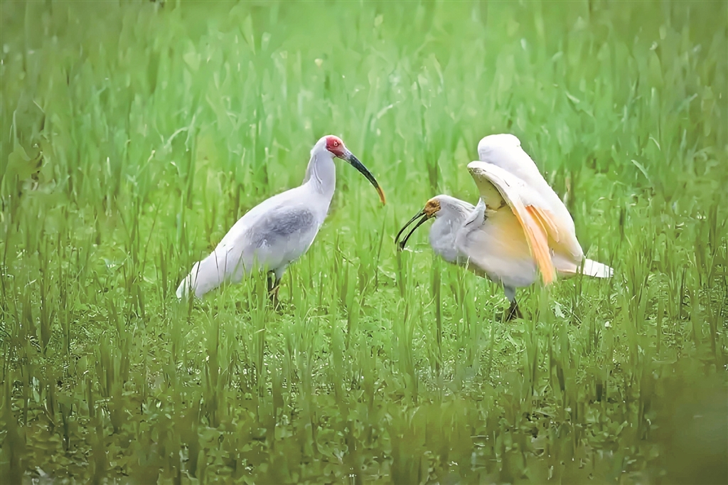 朱鹮在草地上翩翩起舞