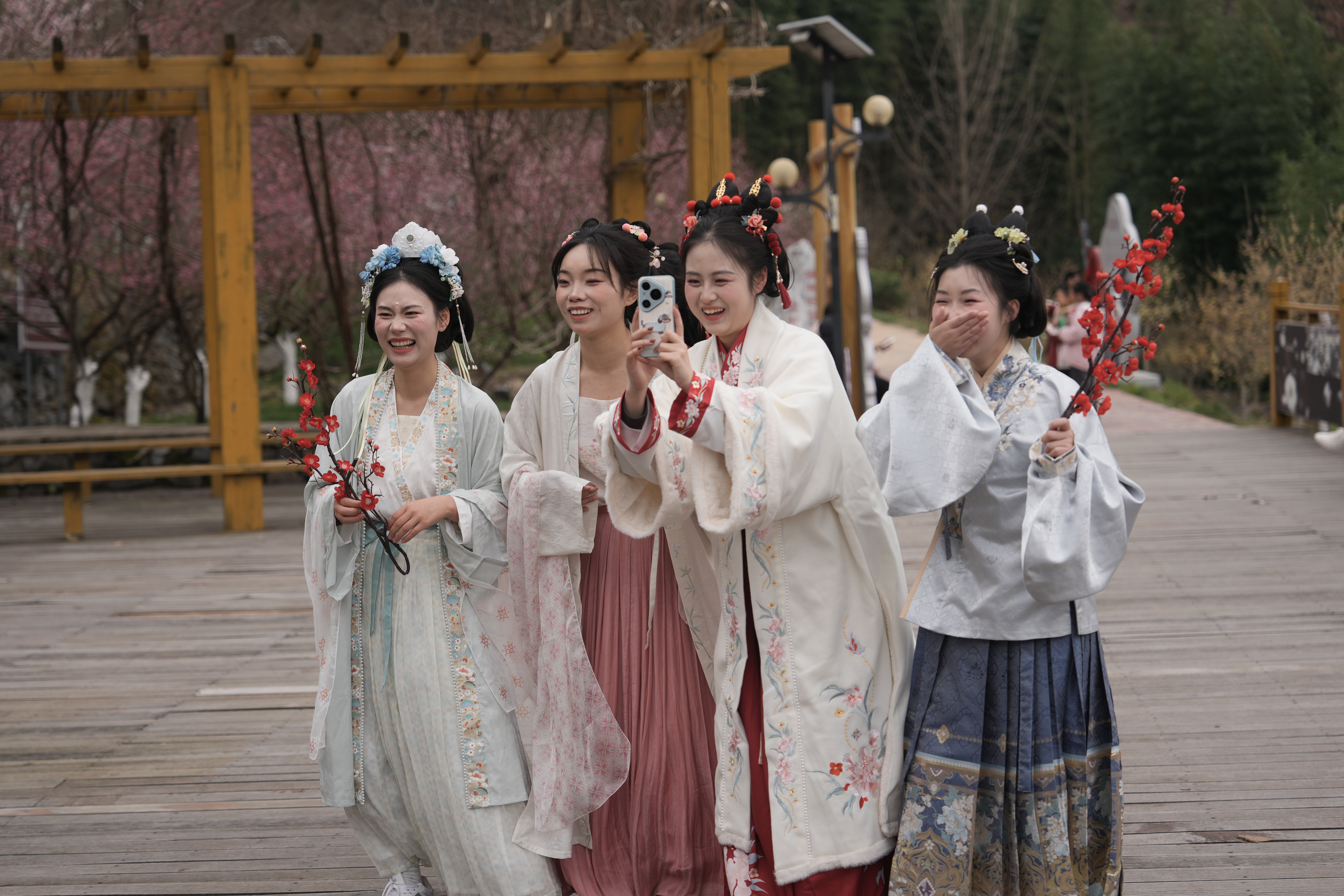 游客穿著漢服在子午梅苑內(nèi)拍照打卡 陳苗 攝