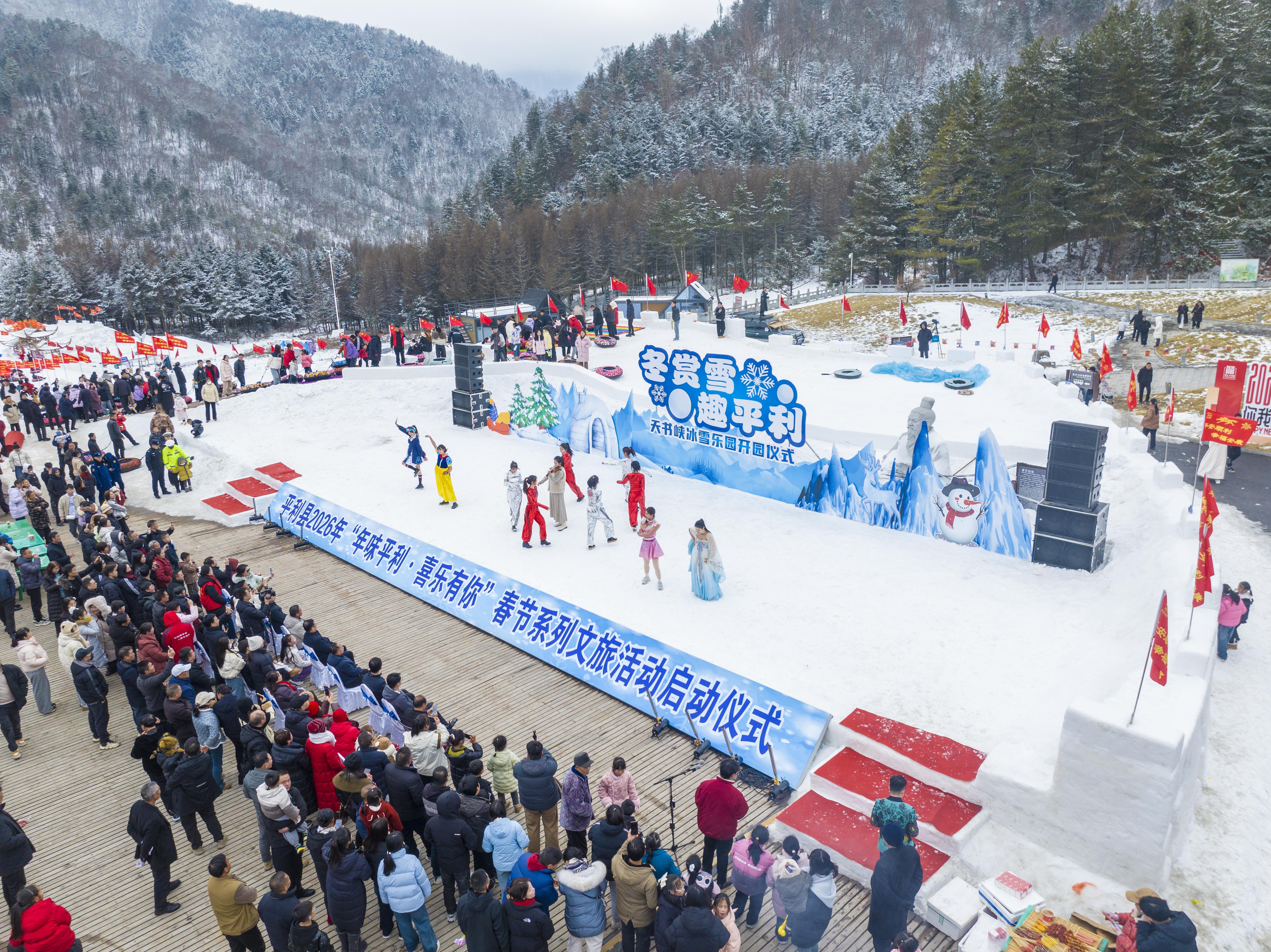 2月1日,“冬賞雪·趣平利”天書峽冰雪樂園暨2026年“年味平利·喜樂有你”春節(jié)系列文旅活動啟動儀式在八仙鎮(zhèn)天書峽景區(qū)舉辦。開園當日,景區(qū)同步開放了冰雪游樂區(qū)、美食體驗區(qū)與農(nóng)特產(chǎn)品展銷區(qū)。在農(nóng)特產(chǎn)品展銷區(qū)集中展示了高山蜂蜜、手工芝麻糖、八仙臘肉等縣域優(yōu)質(zhì)農(nóng)產(chǎn)品,讓游客在游玩的同時,還能把“平利味道”帶回家。