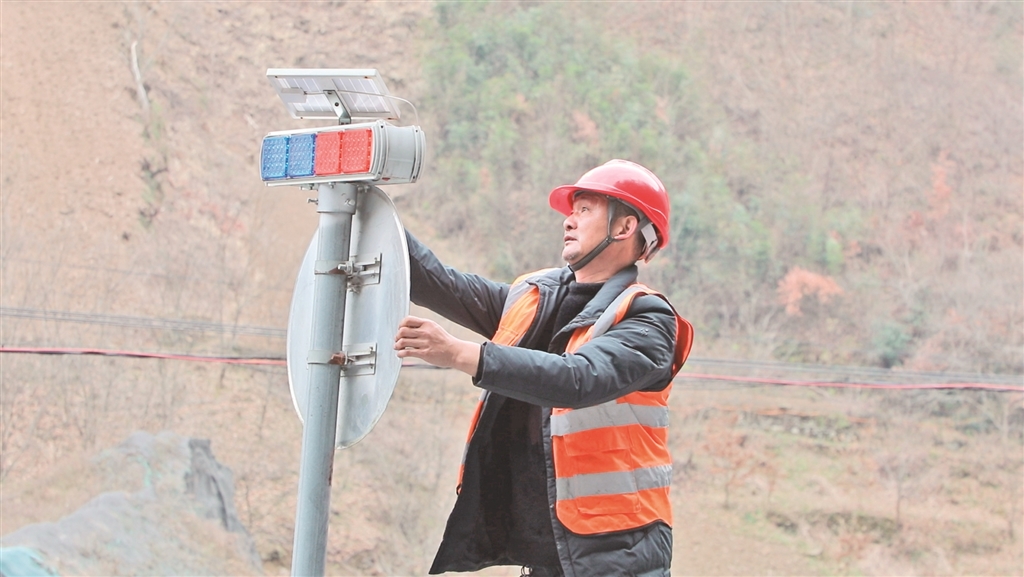 ⑧ 鎮(zhèn)坪公路段松坪養(yǎng)護(hù)中心的養(yǎng)護(hù)人員檢查護(hù)欄警示標(biāo)志,確保群眾出行安全。屈光波 攝