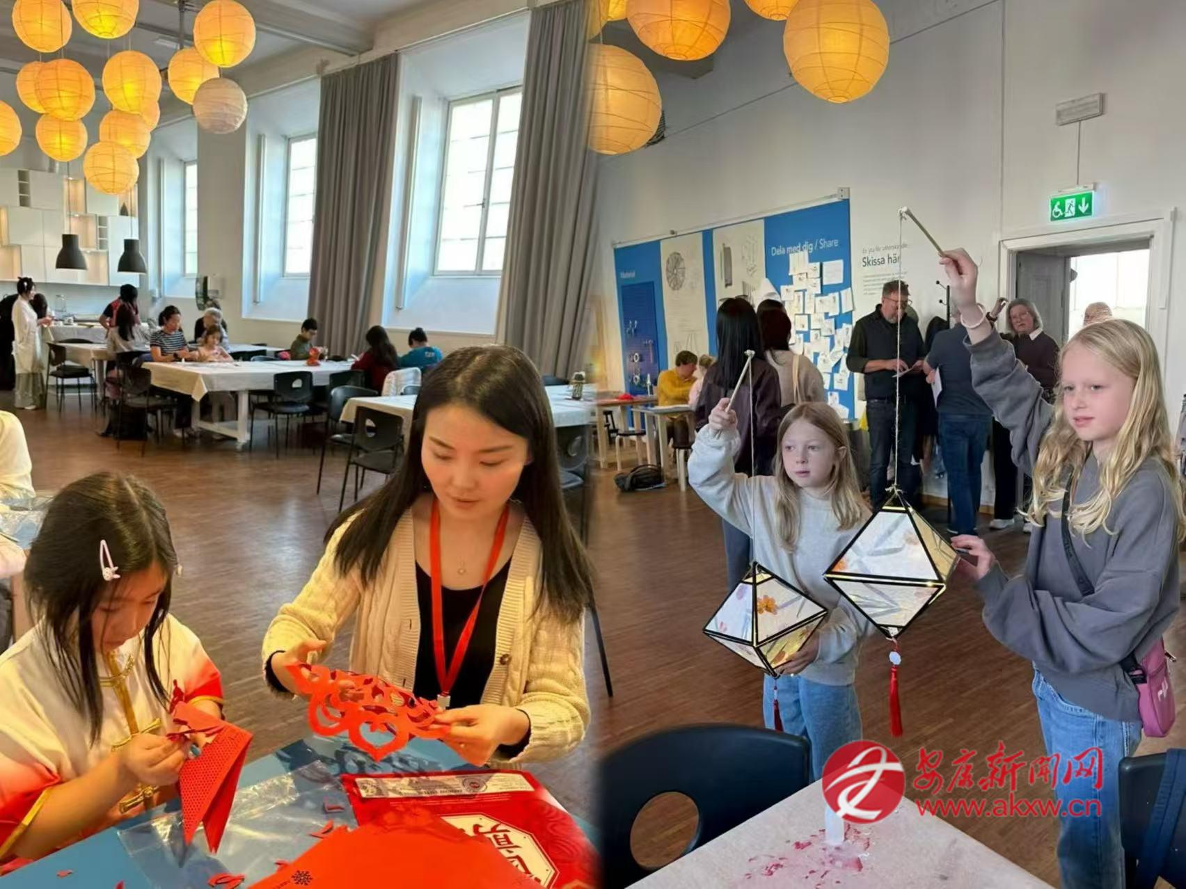 2025年中秋節(jié),在哥德堡市立博物館的展廳里,邱萌教當(dāng)?shù)睾⒆觽冏鰺艋\、剪剪紙。她和孩子們一起用宣紙折疊成燈籠,讓瑞典人得以近距離觸摸中國(guó)節(jié)日。有人好奇地問(wèn)起中秋的月亮,她便講起嫦娥奔月的傳說(shuō),講起月餅的寓意,講起“千里共嬋娟”的詩(shī)句。博物館里點(diǎn)亮了許多盞燈籠,每一盞都映照著孩子們專注而好奇的臉龐。
