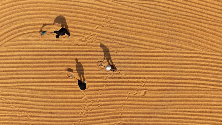 2025年10月28日,在山東省棗莊市市中區(qū)稅郭鎮(zhèn),農(nóng)民晾曬收獲的玉米(無(wú)人機(jī)照片)。新華社發(fā)(孫中喆 攝)