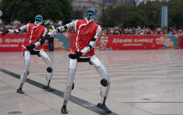 2026年2月28日,宇樹科技人形機(jī)器人在浙江省桐廬縣中心廣場(chǎng)表演舞蹈。新華社記者 黃宗治 攝