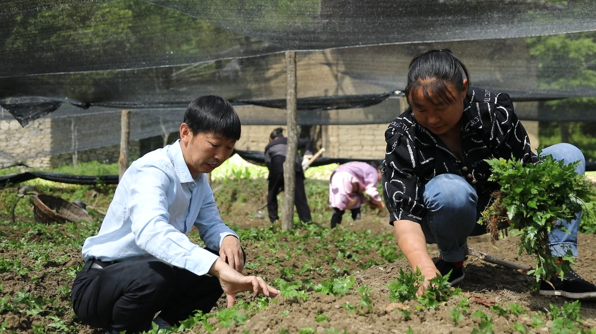 胡榜文(左)在黃連基地指導(dǎo)黃連種植。 屈光波 攝