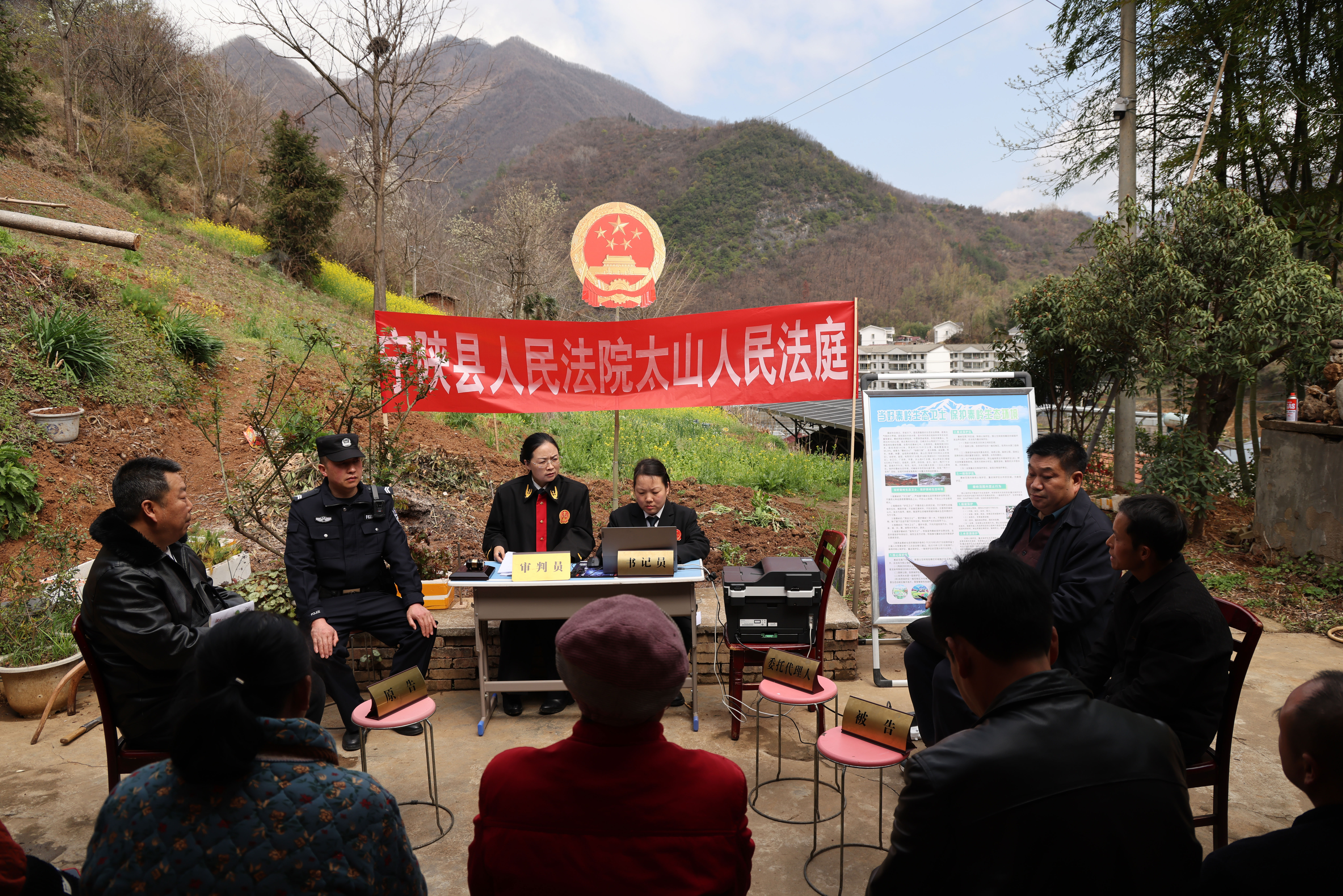 3月24日,在寧陜縣龍王鎮(zhèn)永紅村的田埂旁,金燦燦的花海映襯著莊嚴(yán)的國徽更顯熠熠生輝。寧陜縣人民法院就地審理一起排除妨害糾紛案件,成功化解了鄰里之間的多年積怨,真正實現(xiàn)案結(jié)、事了、人和。