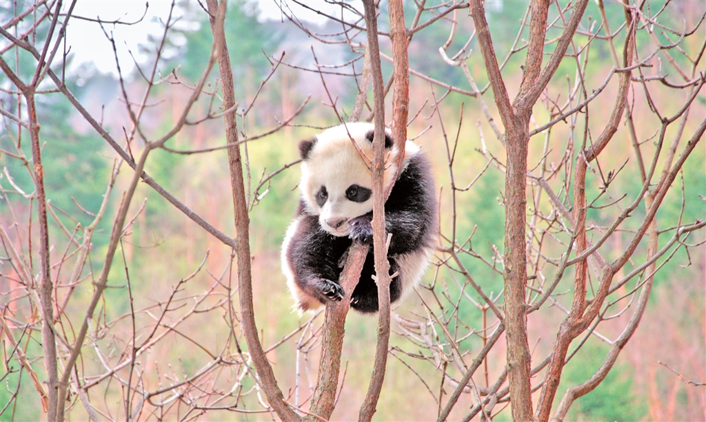在樹上躲避天敵、等待母親歸來(lái)的大熊貓幼崽