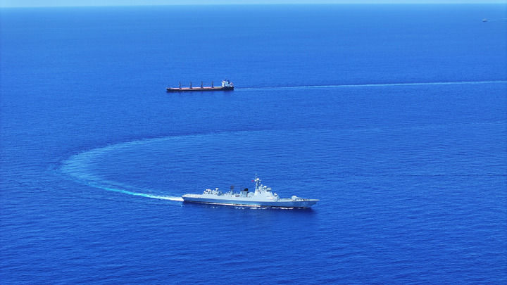 中國海軍第46批護(hù)航編隊焦作艦(下)護(hù)送貨船至解護(hù)點后與之分航(2024年5月7日攝)。新華社發(fā)(張大禹 攝)
