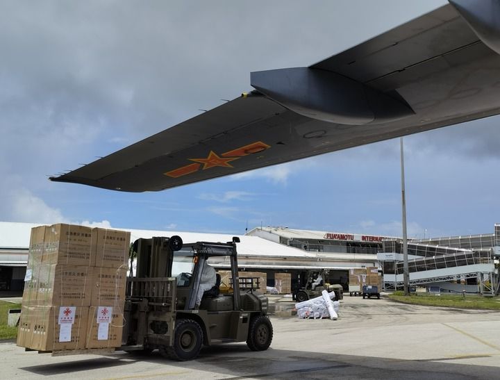 工作人員在湯加首都努庫阿洛法機(jī)場卸載中國運(yùn)-20飛機(jī)運(yùn)送來的援助物資(2022年1月28日攝,手機(jī)照片)。新華社記者 丁增義 攝