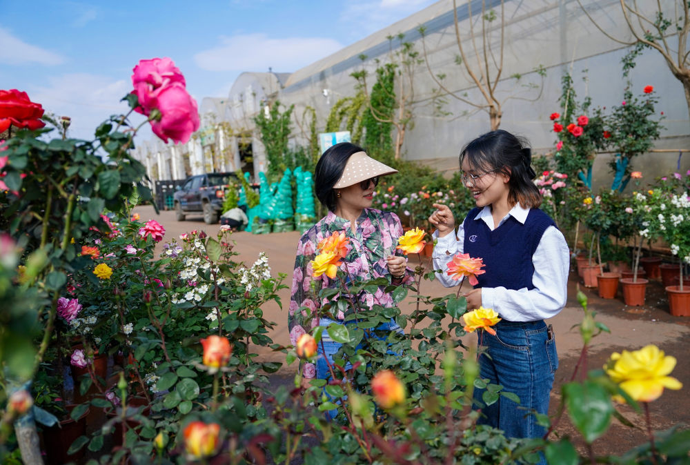 2025年4月11日,越南花商阮翠云(左)與翻譯李青歌在云南昆明斗南一花卉基地內(nèi)查看鮮花品質(zhì)。2018年,阮翠云開始在越南銷售云南花卉,讓七彩“云花”成為眾多越南家庭的“常客”。借助高效的電商平臺(tái)和快捷的物流網(wǎng)絡(luò),鮮花從云南花田到河內(nèi)貨架實(shí)現(xiàn)了“次日達(dá)”。