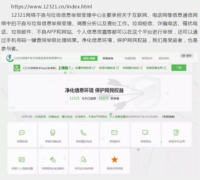 12321網絡不良與垃圾信息舉報受理中心主要承擔關于互聯網、電話網等信息通信網絡中的不良與垃圾信息舉報受理、調查分析以及查處工作。垃圾短信、詐騙電話、騷擾電話、垃圾郵件、不良APP和網站、個人信息泄露等都可以在這個平臺進行舉報,還可以通過手機號碼一鍵查詢舉報處理結果。凈化信息環(huán)境,保護網民權益,我們是受益者,也是參與者。