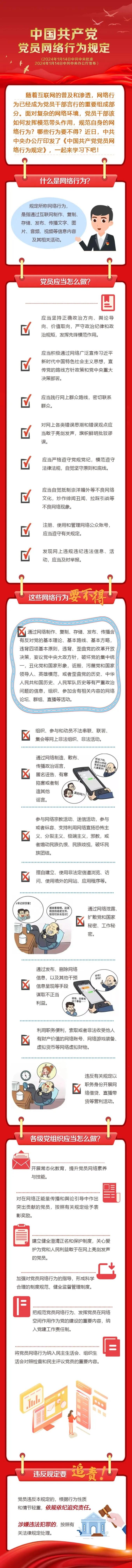 《中國共產(chǎn)黨黨員網(wǎng)絡(luò)行為規(guī)定》于2024年1月14日經(jīng)黨中央批準(zhǔn)、辦公廳發(fā)布后同日施行,它是第一部規(guī)范黨員網(wǎng)絡(luò)行為的黨內(nèi)法規(guī),是全體黨員使用網(wǎng)絡(luò)的根本遵循,共計(jì)5章31條。