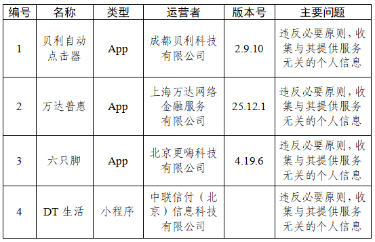 三、貝利自動點擊器、萬達普惠等4款A(yù)pp違反必要原則,收集與其提供的服務(wù)無關(guān)的個人信息(詳見下表)。