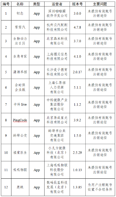 四、初念、零零汽等12款A(yù)pp未提供有效賬號注銷途徑或為用戶注銷賬號設(shè)置不合理條件(詳見下表)。