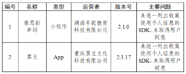 二、雅思斬單詞、票豆等2款A(yù)pp未逐一列出收集使用個人信息的SDK,未取得用戶同意(詳見下表)。