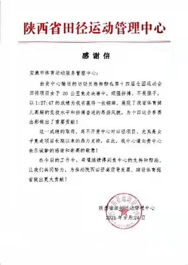 據(jù)了解,由安康市體育中心輸送的安康籍運(yùn)動(dòng)員楊柳靜在第十四屆全運(yùn)會(huì)田徑項(xiàng)目女子競(jìng)走20公里決賽中為陜西省贏得一枚銅牌。感謝信中寫道:“希望雙方共同努力,為推動(dòng)陜西田徑高質(zhì)量發(fā)展,建設(shè)體育強(qiáng)省做出更大貢獻(xiàn)!”