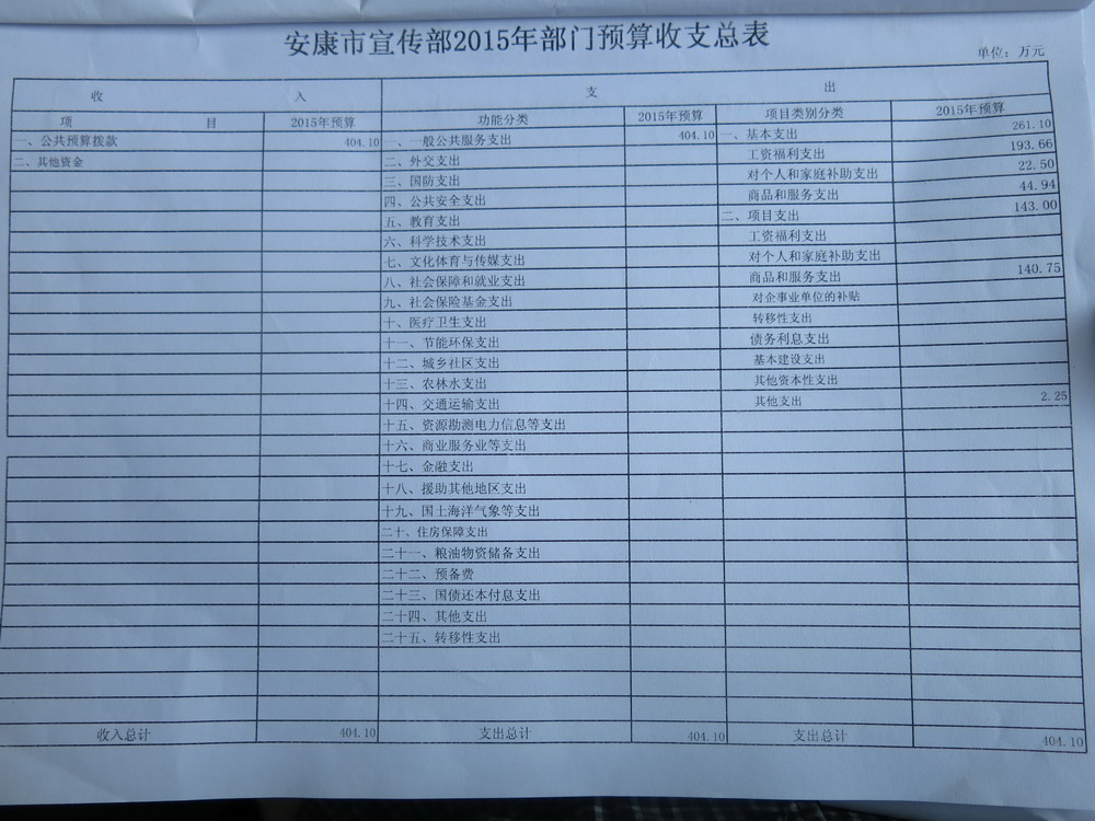 2015年部門收入預(yù)算數(shù)4,041,000元,全部為一般預(yù)算財政撥款收入;支出預(yù)算4,041,000元,包括工資福利支出1,936,600元,商品和服務(wù)支出449,400元,對個人和家庭補(bǔ)助支出225,000元,項(xiàng)目支出1,430,000元。