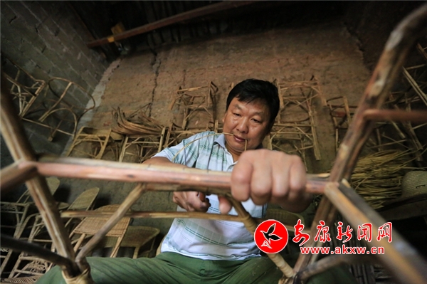 在白河大山深處,能編織制作藤椅的手藝人現(xiàn)在已經(jīng)不多了,經(jīng)過四處打聽得知,五十二歲的周晉車仍然堅(jiān)守著自己的技藝。家住白河縣冷水鎮(zhèn)花灣村三組的周晉車高中畢業(yè)以后,1988年就開始拜師學(xué)藝,逐漸掌握了剝、劃、拋、砍、燒、磨、纏、編、裁、劈、剖、削、撕、勻、刮等十八道工序以及粗、細(xì)藤條的全套編織技法。慢慢地,周晉車師傅遠(yuǎn)近聞名,不少外地客戶上門定做,產(chǎn)品一度銷售到西安、武漢、十堰、竹山、平利等地。