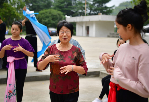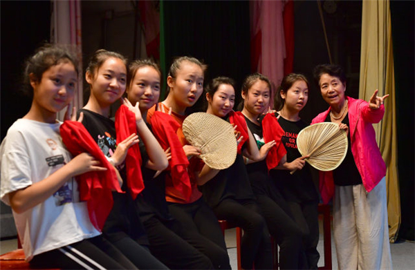 9月12日,漢調二黃國家級傳承人王發(fā)蕓(中)在向“童子班”學員示范劇目中的動作。